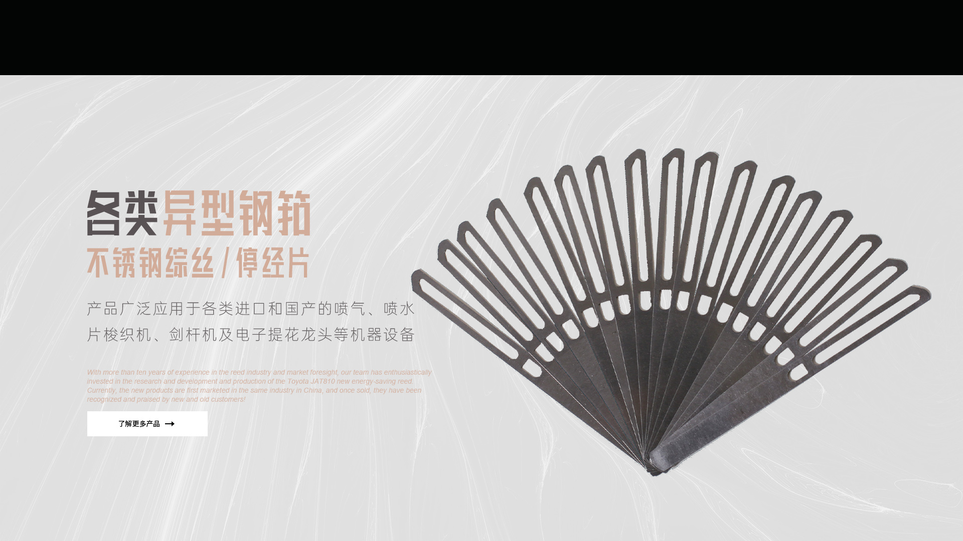 從事研發(fā)生產(chǎn)及銷售各類新型紡織器材的生產(chǎn)型企業(yè)。公司主要產(chǎn)品有:噴氣織機用各類異型鋼筘(傳統(tǒng)型豐田JAT710鋼筘及新研發(fā)的豐田JAT810節(jié)能筘);不銹鋼綜絲及不銹鋼停經(jīng)片。我們的產(chǎn)品廣泛應用于各類進口和國產(chǎn)的噴氣、噴水、片梭織機、劍桿機及電子提花龍頭等機器設備。